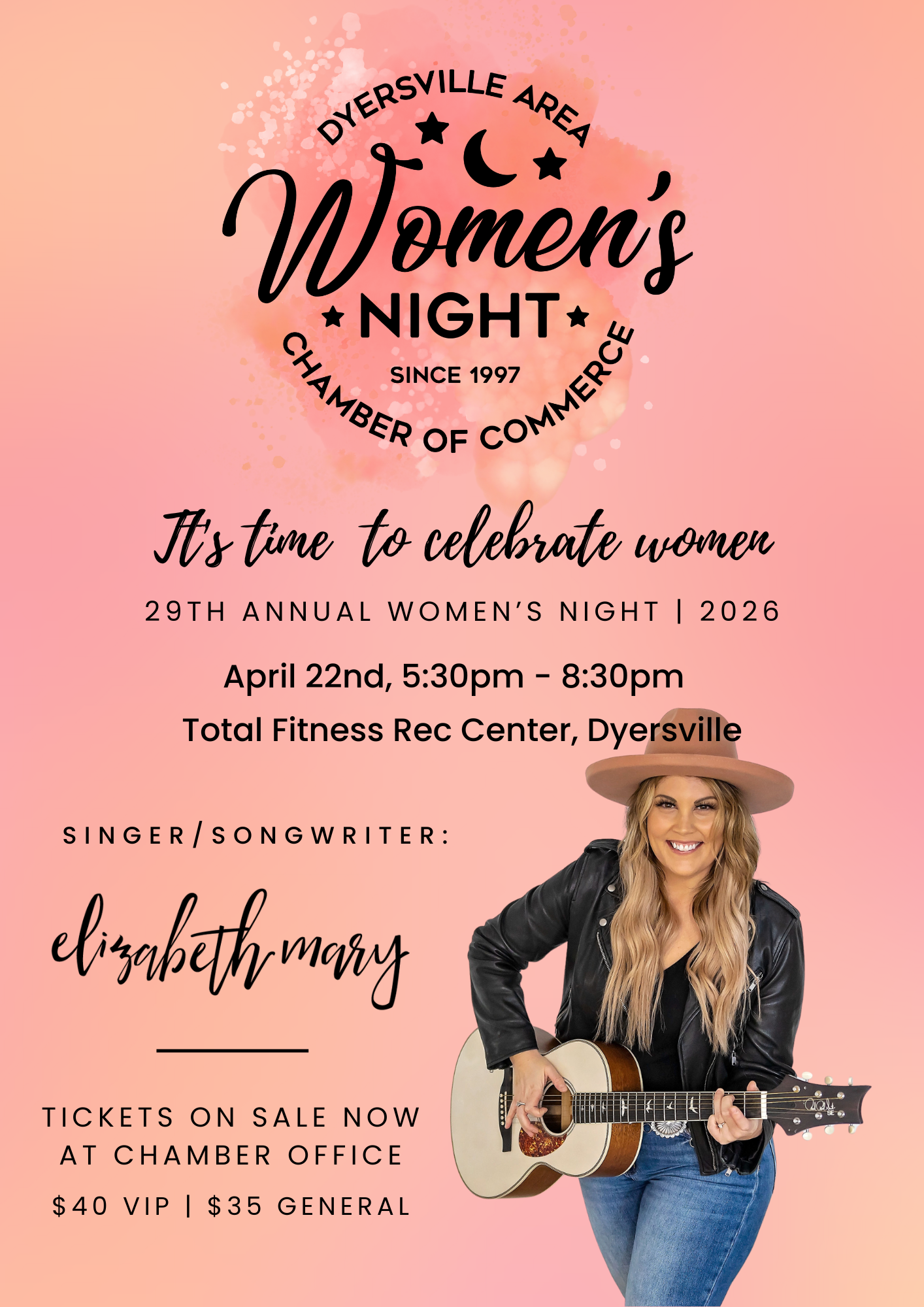 Set for Wednesday, April 22, 2026, from 5:30 PM – 8:30 PM at Total Fitness Rec Center in Dyersville. Enjoy an evening of inspiration, shopping, and celebration with keynote singer/songwriter Elizabeth Mary. The night includes dinner & dessert by J&D Catering, raffle prizes, local vendors, and the 2026 Woman of the Year celebration.