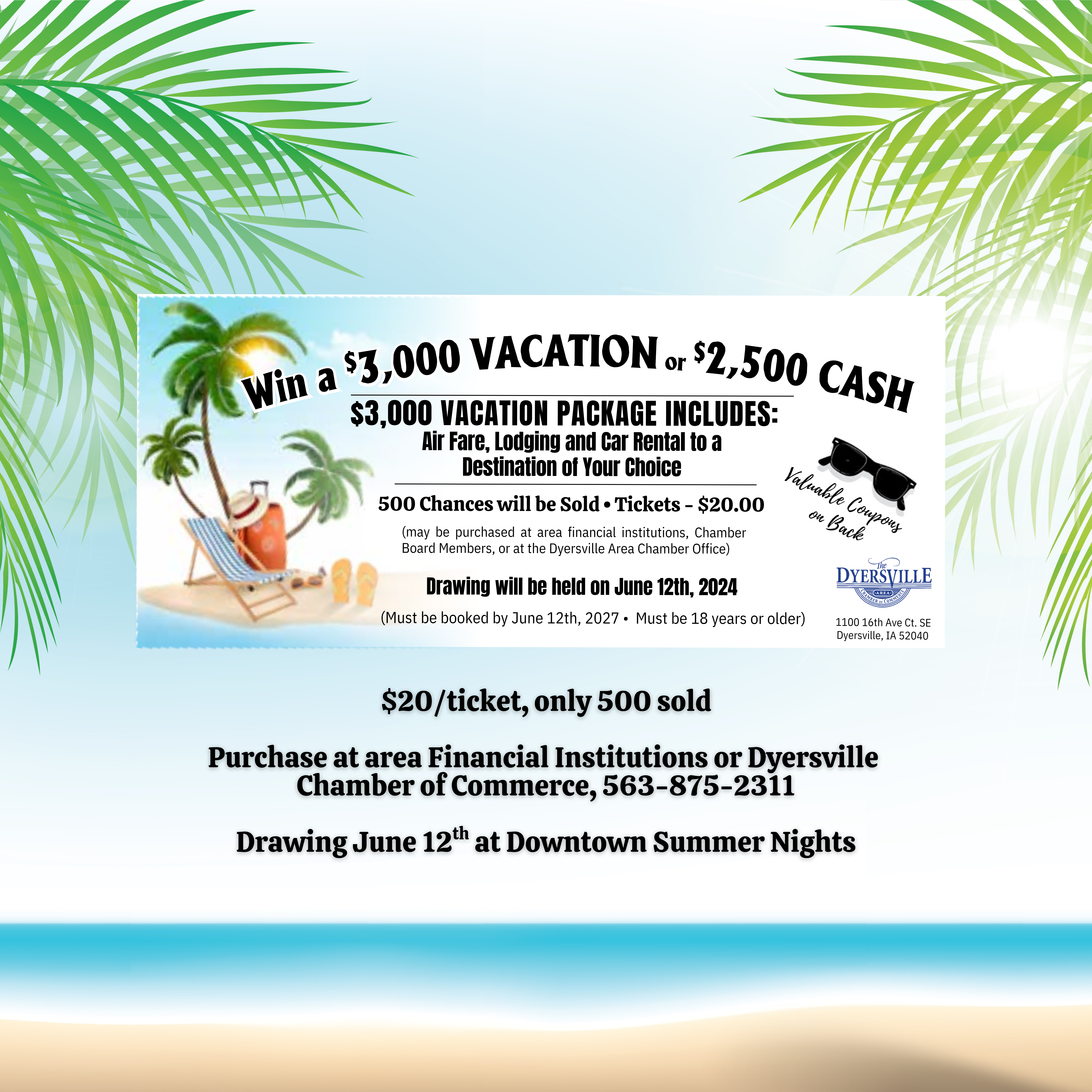 Don’t forget to purchase your ticket for our Vacation/Cash Raffle! One lucky winner will walk away with the choice of a dream getaway or a cash prize. Tickets are available now at area financial institutions, the Chamber office, or through any Chamber Board Member. Your meal and your ticket go a long way in supporting Chamber programs and events throughout the year. See you there!